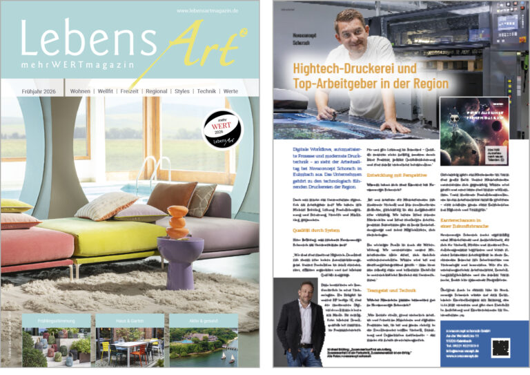 In der Ausgabe vom Frühjahr 2026 präsentiert das mehrWERTmagazin LebensArt² novaconcept schorsch als Hightech-Druckerei und Top-Arbeitgeber in der Region.